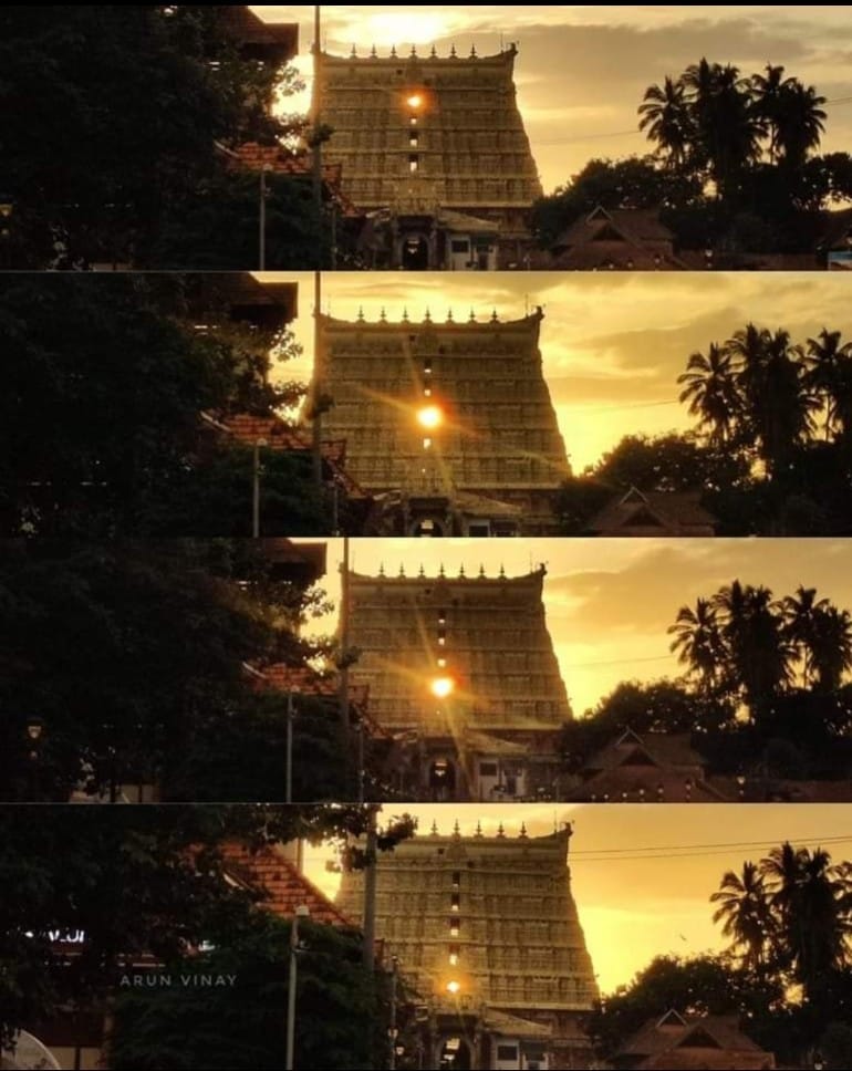 ഇന്നലെ ശ്രീ പദ്മനാഭ സ്വാമി ക്ഷേത്രത്തിന്റെ കിഴക്കേ ഗോപുരത്തിന്റെ ഏഴു നിലകളിലെ ജാലകങ്ങളിലൂടെ നേർരേഖയിൽ താഴോട്ട് വരുന്ന സൂര്യനെ കാണുക….